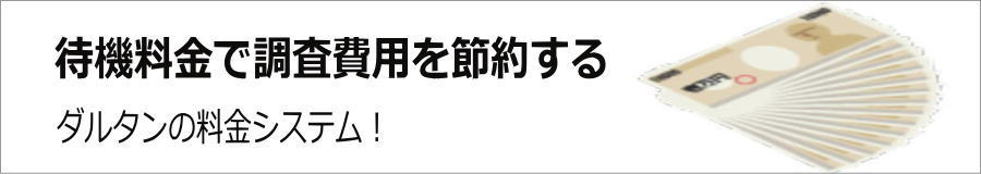 | お客様の負担を軽減した料金システム 調査を一時中断する場合(出勤したので夕方まで出ないと判断される調査) 待機料金=30分調査員1名/500円 上記の場合8時間の待機料金が発生=調査員2名/16,000円 ※待機料金は開始時より、調査を継続して行なう場合に適用されます。 |